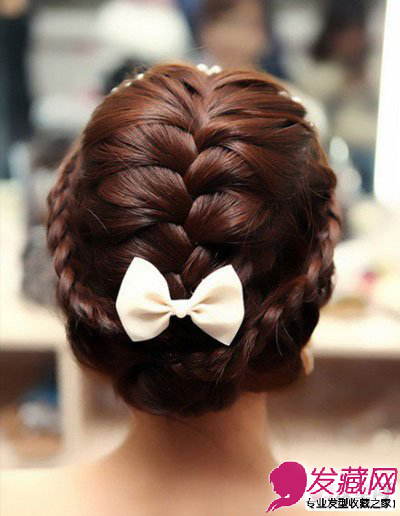 将蜈蚣辫的元素加入到新娘发型中是非常新颖的,收到很多MM们的青睐。在两侧编成麻花辫,缠绕在两侧,非常优雅的韩式风格哦。戴上白色蝴蝶结,更加吸引人了。