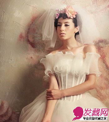 非常有格调的一款新娘发型,自然的黑发简单的盘起来,清新纯净,头顶装饰灿烂绽放的花朵,在洁白的发纱的笼罩下,更是优雅动人。