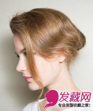 将自然卷度的长发在耳后的高度利用内卷的方式盘好,适当的盘松可以令侧面形成自然的弧度,偏分刘海侧梳,让波浪纹路与脑后发髻自然衔接。自然垂散的发丝增添闲适感觉。