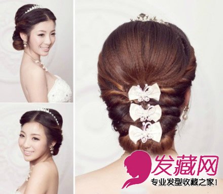 和新娘发型最适合发饰之一的就是蝴蝶结了,通过编发别上蝴蝶结,发短或少的女生可只编两道,用发簪装饰的头发中间要鼓好,可人的这款新娘头配上耳环和项链就更完美了。