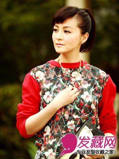 中长发高高的扎成马尾辫很是时尚干练,整齐的剪裁与厚重的刘海很好的修饰了脸型,让她的脸型更加小巧精致,搭配这一身服装很是时尚有范。