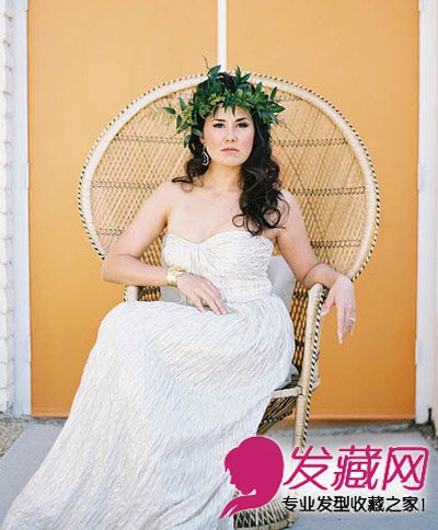 浪漫的卷发随性地披散在肩头,头顶上顶着一款绿色的橄榄叶子头冠,拥有希腊女神般的模样让人充满向往。