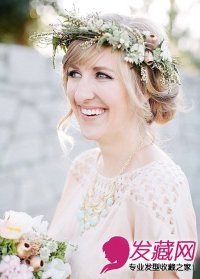 凌乱的盘发设计搭配一款绿色树枝手编而成的花环,轻松自在中散发自然魅力。