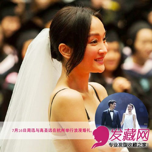 简单将长刘海中分,将长发盘起,再带上白色头纱,露肩修身婚纱显得周迅更是窈窕可人。