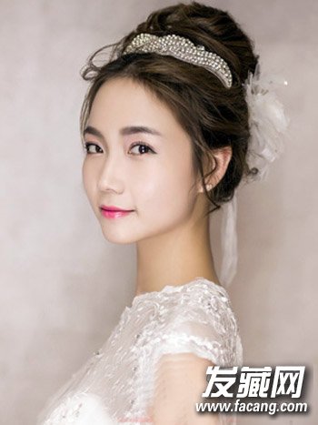 这款韩式花苞头新娘盘发也是很多准新娘们心水的气质发型,蓬松感十足的高发髻扎发显高显瘦,搭配发饰点缀更显脱俗的仙气。