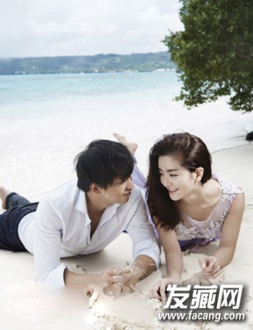 在浪漫的海边,一对小情侣简洁的礼服,简单的发型躺在沙滩上,深情对视,尽显点滴小幸福。