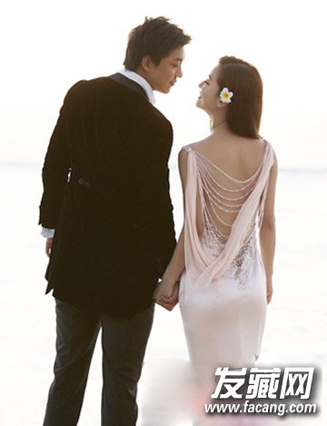 一身黑色燕尾服的李佳航,清爽短发魅力十足,新娘李晟,一袭超美的露背装,侧边新娘发型,优雅性感。