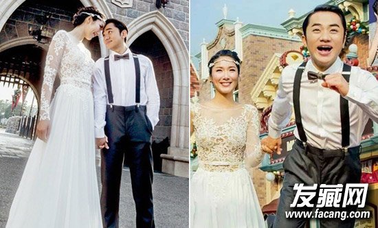 两人在迪士尼拍摄的婚纱照,巧用镜头避开了升高的高矮差距,李亚男简洁的盘发搭配公主发饰很是唯美动人。
