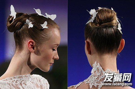 1、高盘发:像模特的一样把“花骨朵”高高定于头顶,这样的发型看上去很是干净,加以白色的蝴蝶作为点缀,衬得新娘的妆容更加灵动。