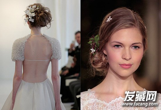 3、卷发盘发:除了传统的盘发之外,现在略显凌乱的卷发盘发在秀场上也很是走俏。卷发总是能带给人一种浪漫的感受,斜分的刘海加上偏在一侧的“花骨朵”,特别是这样的发型对于30+的新娘来讲很是显得有活力。