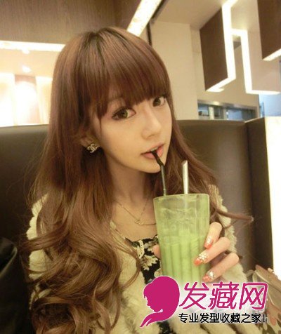 小编点评:齐刘海的长卷发,大受MM们的欢迎,显得特别乖巧甜美,还能减龄。这款很适合长脸的MM哦。大大的卷发,让你一看就有好感。棕色系的发色将肌肤衬得白皙,更显小女生。