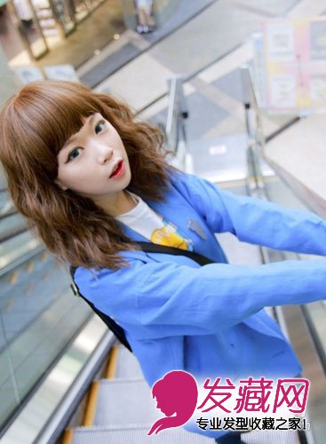 小编点评:厚厚的齐刘海,长度在眉毛边际,遮住额头缺陷也巧妙隐藏1/3脸,蓬松的波浪卷发营造无辜感。