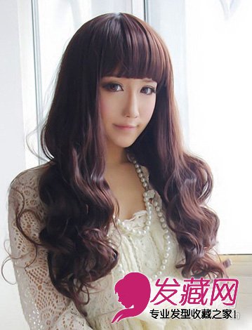 小编点评:厚厚的齐刘海显得脸型更加小巧精致,长长的头发烫上浪漫的大卷,很像芭比娃娃般甜美优雅。萌系女生可以尝试这款发型哦。