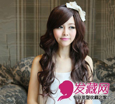 小编点评:斜刘海的MM们,可以尝试着增加刘海的发量,可以显得脸型更加精致小巧。齐腰的长发烫上浪漫的波浪大卷,很像童话中优雅甜美的公主。