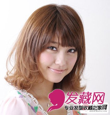 发梢烫卷最外层的几缕发丝向内扣,大部分头发外卷,显得轻盈动感,巧妙遮盖住方脸僵硬的缺点,加上微微侧分的齐刘海,刚好修饰出小脸效果。