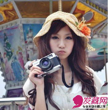 嘟起的小嘴加上齐腰的大波浪卷发,显得小脸更加圆润可爱,侧分的斜刘海刚好遮盖了过长的额头,圆脸的美眉可以考虑下这款发型。