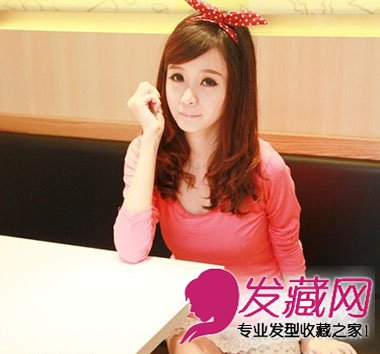 斜刘海中长卷搭出萌系少女造型,大红色圆点蝴蝶结发带,映衬红色打底衫,白色蕾丝短裤小性感