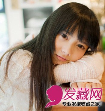 服帖的黑色长直发,整齐的直刘海遮盖双眉,精致的五官与圆圆的小脸搭配在一起,散发出婉约的气质。