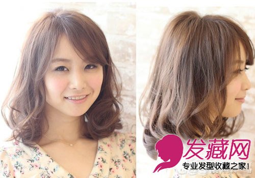 中长的卷发头,显得皮肤特白皙细嫩,内扣的侧刘海,露出一点点额头,将圆圆的脸蛋拉长了,长长的蓬松感十足的发梢,也修窄了胖胖的圆脸。