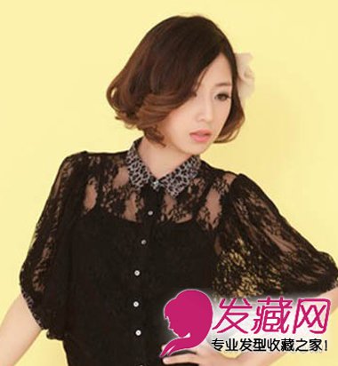 女生的短发覆耳梨花卷,包裹住了女生的少许脸颊,很好的修饰了圆脸脸型,中分的刘海发型,露出了女生的五官,立体感十足,上身黑色蕾丝的衣服,塑造出了一个潮流时尚的女生形象。