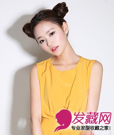 两个侧扎的高发髻扎发发型,有着蓬松的发型效果,从视觉上起到了小脸的效果俏皮可爱的双发髻扎发发型,简单