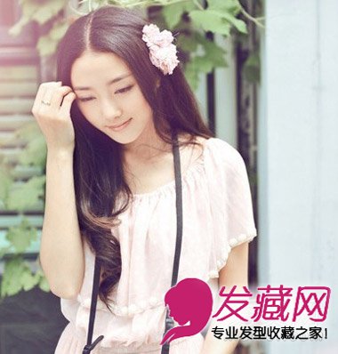 小清新气质的中分卷发发型,乌黑莹亮的发丝最具古典韵味,垂坠的发卷自然的清新妩媚气质,搭配发饰,婉约柔美。