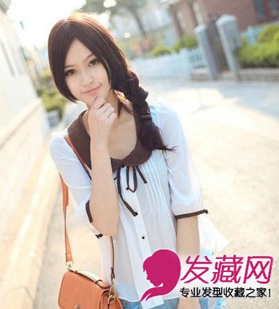 这款发型一看就知道是甜美复古类型,四六分的刘海完美修饰的胖圆的脸蛋,随意的大辫子歪歪地打在肩膀上,略带性感。