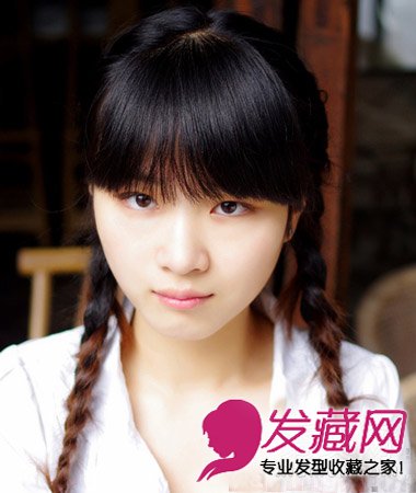 小清新范儿长发扎法,挑染棕色的发丝扎细细的双马尾发辫,齐眉刘海修饰脸型,简单清纯。
