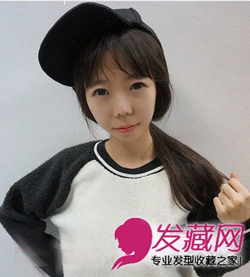 自然黑色发色简单清纯,轻薄的刘海塑造出精致的小V脸脸型,侧扎发马尾简单不失时尚气息,搭配一顶休闲帽,更加时尚好看。