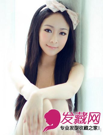 乌黑的长直发简简单单的发型,搭配上粉色的蝴蝶结发箍,简单清丽的造型。