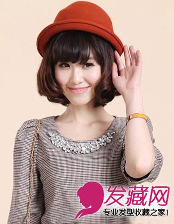 适合任何年龄层,尤其是韩范的齐刘海包裹着脸蛋,散发出甜美亲和感,内扣的烫发发丝将脸型衬托的更加小巧,一顶礼帽搭出潮感。