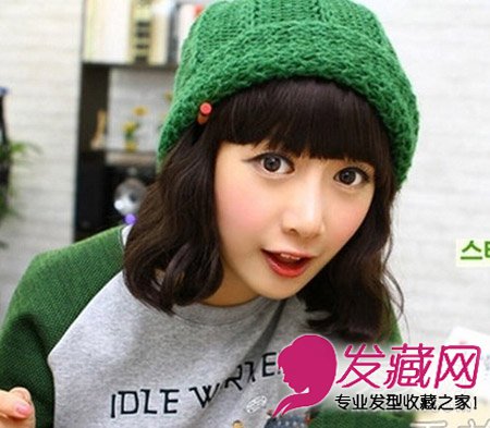 齐刘海的短卷发,将非常的显得精灵活泼,而且还起到瘦脸又减龄的效果,再配上一款绿色毛线帽更加甜美可爱呢!