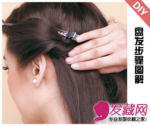step2:取出左侧的刘海,扭转成发辫后用铁质发夹固定。