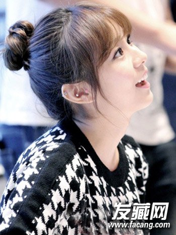 很有呆萌气息的一款齐刘海丸子头发髻扎发,挑染发色很有韩流时尚气息,简单的发髻扎发配合空气感刘海修颜扮嫩。