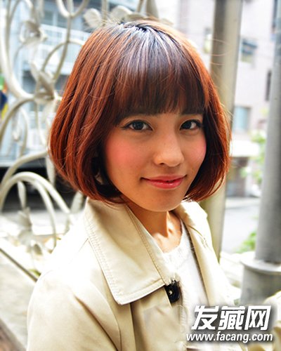 ,棕色的发色时尚靓丽,微分的齐刘海修饰了圆脸。