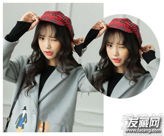 小清新范十足的一款中长卷发发型,空气刘海与中长卷发勾勒出别致的时尚感来,搭配上俏皮时尚的格子帽十分抢眼。