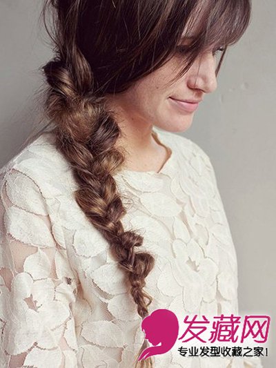 打造要点:这组编发发型要突出的要点是蓬松感,并不似普通麻花辫那般服帖,用梳子为发丝留出适当的空气看起来会更时尚。同时,鱼骨辫是低梳在耳下的,为了不让马尾位置松动 ,需要特别的固定方法。