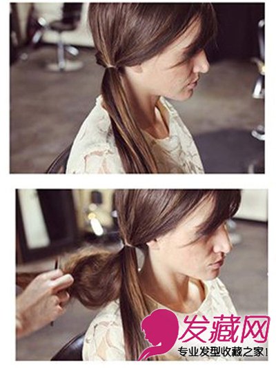 Step2:将两股发丝旋转凝成马尾辫,斜着低梳在耳下的部位,用橡皮筋固定好。