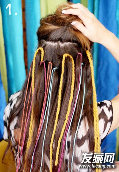 将五彩毛线编织成一股一股,然后分别系在一撮一撮的头发上,然后再进行编发。