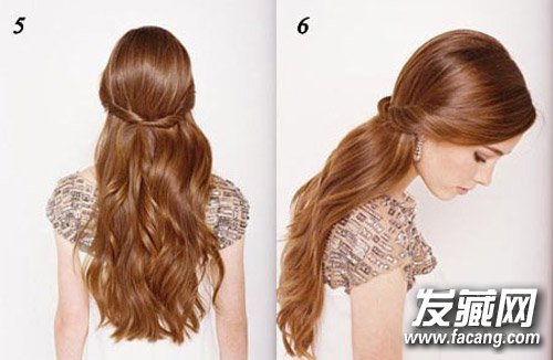 step5-6、接下来,再用小发夹将交叉的两束头发固定牢。这款半扎发就大功告成了。