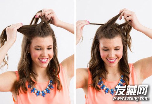 4.这一步有点难,不过你可以做到的!你的左手持着3股辫子,拉到左侧。你的右手从右侧拉起另外一股头发。