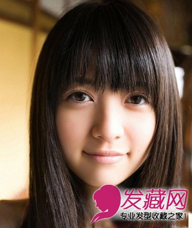 ,重点在于齐刘海的设计,层次齐刘海较长部分遮住宽宽的颧骨正好起到修颜作用,柔顺直发显得飘逸动感。