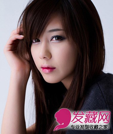 韩系偏分长直发打造出来的淑女范儿,斜刘海修颜,这款染发颜色也是很多爱美的MM喜爱的,非常衬肤色。