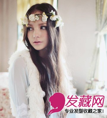 ,自然微卷的造型为整款长发增添了无限温柔气息,发间用花冠点缀,唯美灵动天使一般。