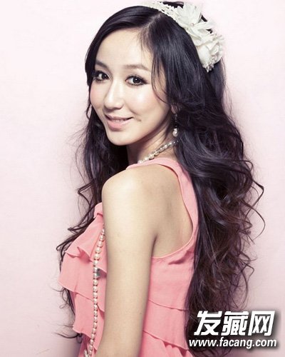 头发侧分有不对称美感,复古大波浪外卷发散发优雅气息,白色的发饰提升气质感。