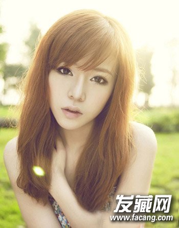 金棕色的中长发,简约时尚,搭配上清新的斜刘海设计,不仅修饰脸型,同时也凸显出mm甜美的样子。