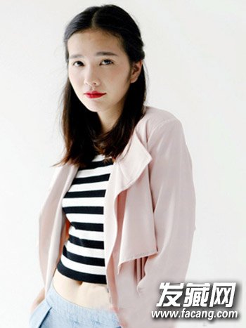 很有文艺范儿的一款韩国女生齐肩发,简单的齐肩中分中长发扎半扎发造型,露额发型清爽甜美。
