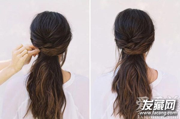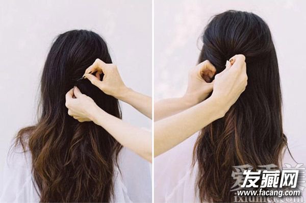 Step3:将上层头发依照左右顺序全部别到后脑勺下方,只留下下层少量头发即可~当然,这个