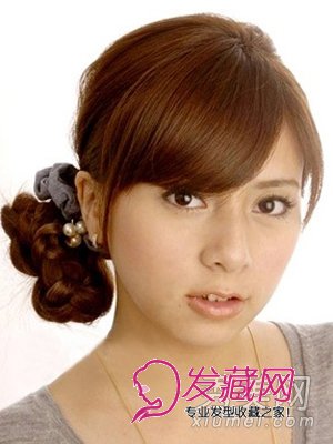 将头发先编成麻花辫子后扎成丸子,配合半月圆刘海,优雅高贵而带有一点可爱气息,很适合非正式的派对或宴会场合哦。